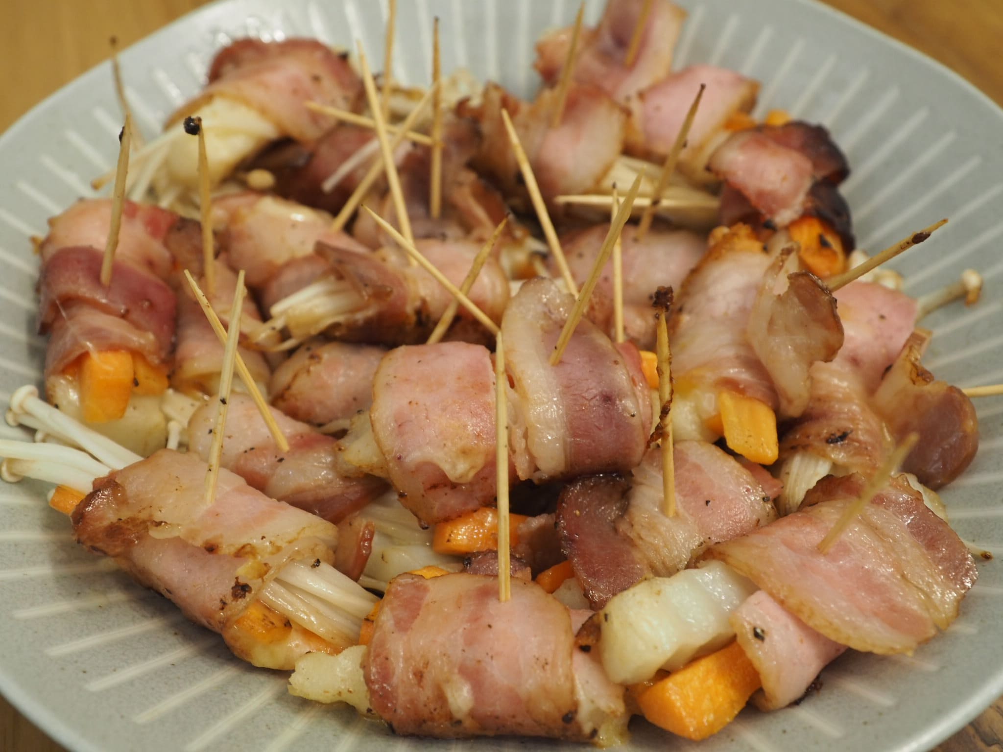 ポテトや人参、えのきを豚肉で巻いて食べたいと思ったのですが、現在台湾ではアフリカ豚熱の影響でスーパーから豚肉がなくなってしましました。そこでベーコンを使って巻いて食べました。ベーコンに油が結構あったので、油を使う必要ななかったですね。